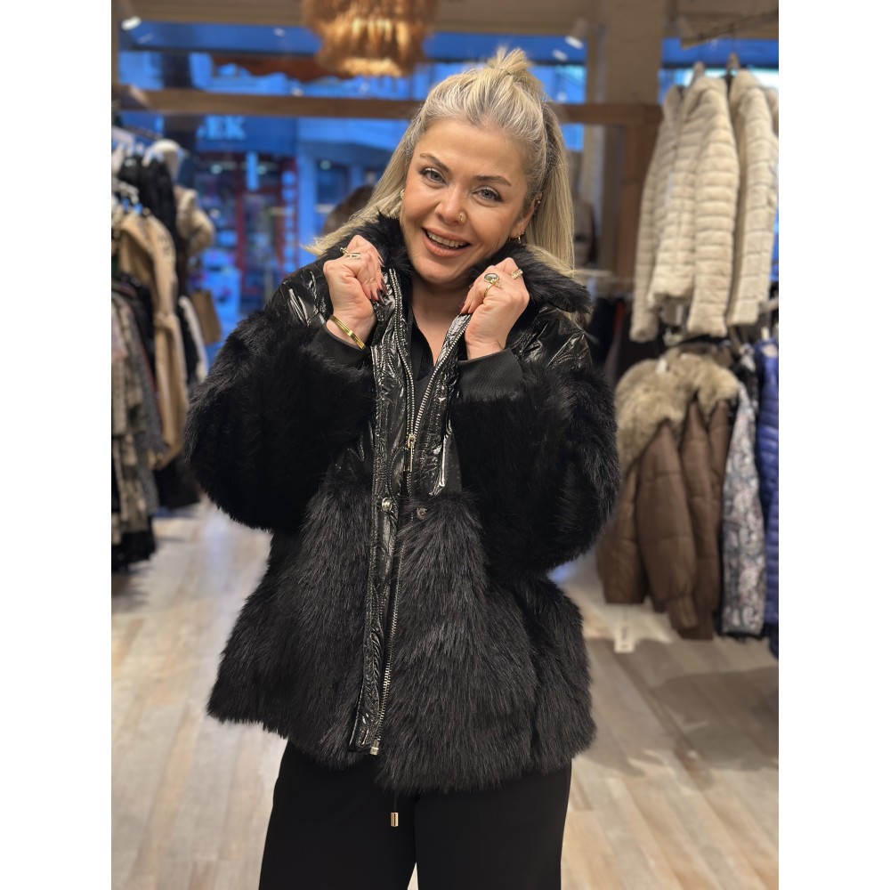 Kolları kürklü rahat kalıplı, rugan-kürk kombinli mont